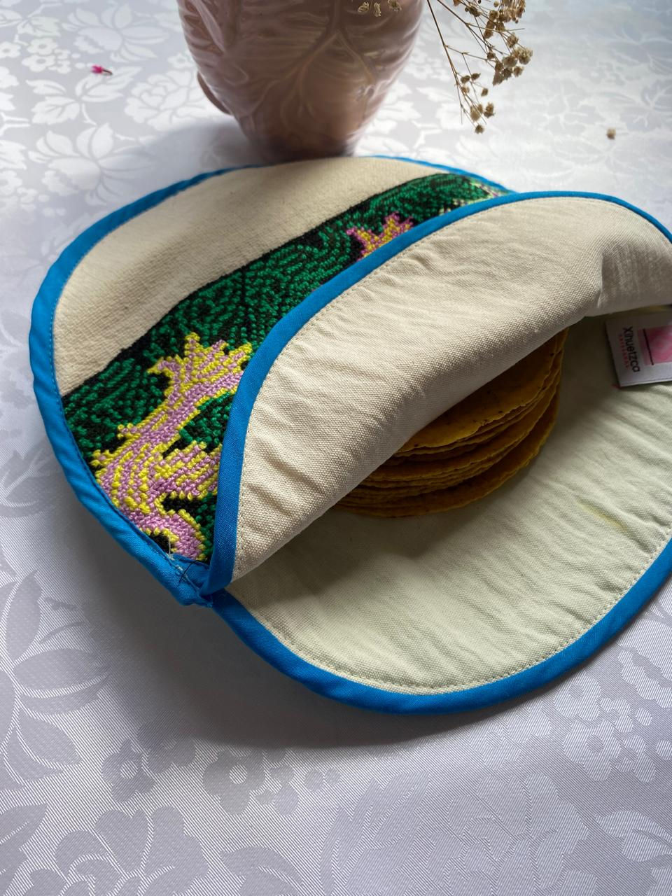 Descubre la belleza y tradición de nuestros tortillero artesanales, Elaborado Con telas artesanales, Su diseño único con aplicación bordada a mano. mantiene tus tortillas calientes, mientras añade un toque especial a tu mesa. Ideal para quienes valoran la calidad, el arte y la cultura en cada detalle. ¡Haz de cada comida una experiencia auténtica!